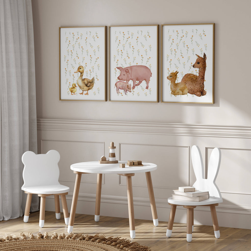 Bring the sweet charm of the countryside into your baby’s room with this adorable collection of 7 watercolour nursery prints featuring farm animal mothers and their babies.
