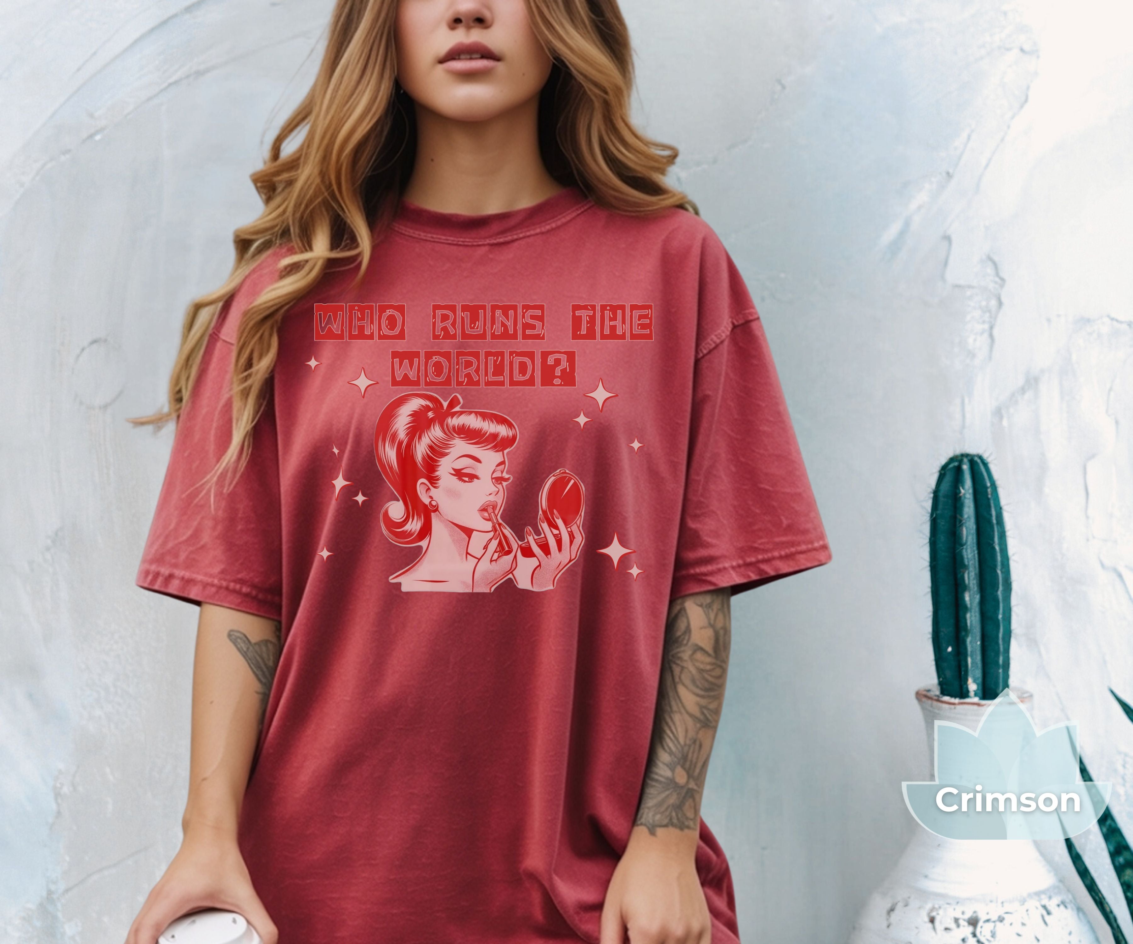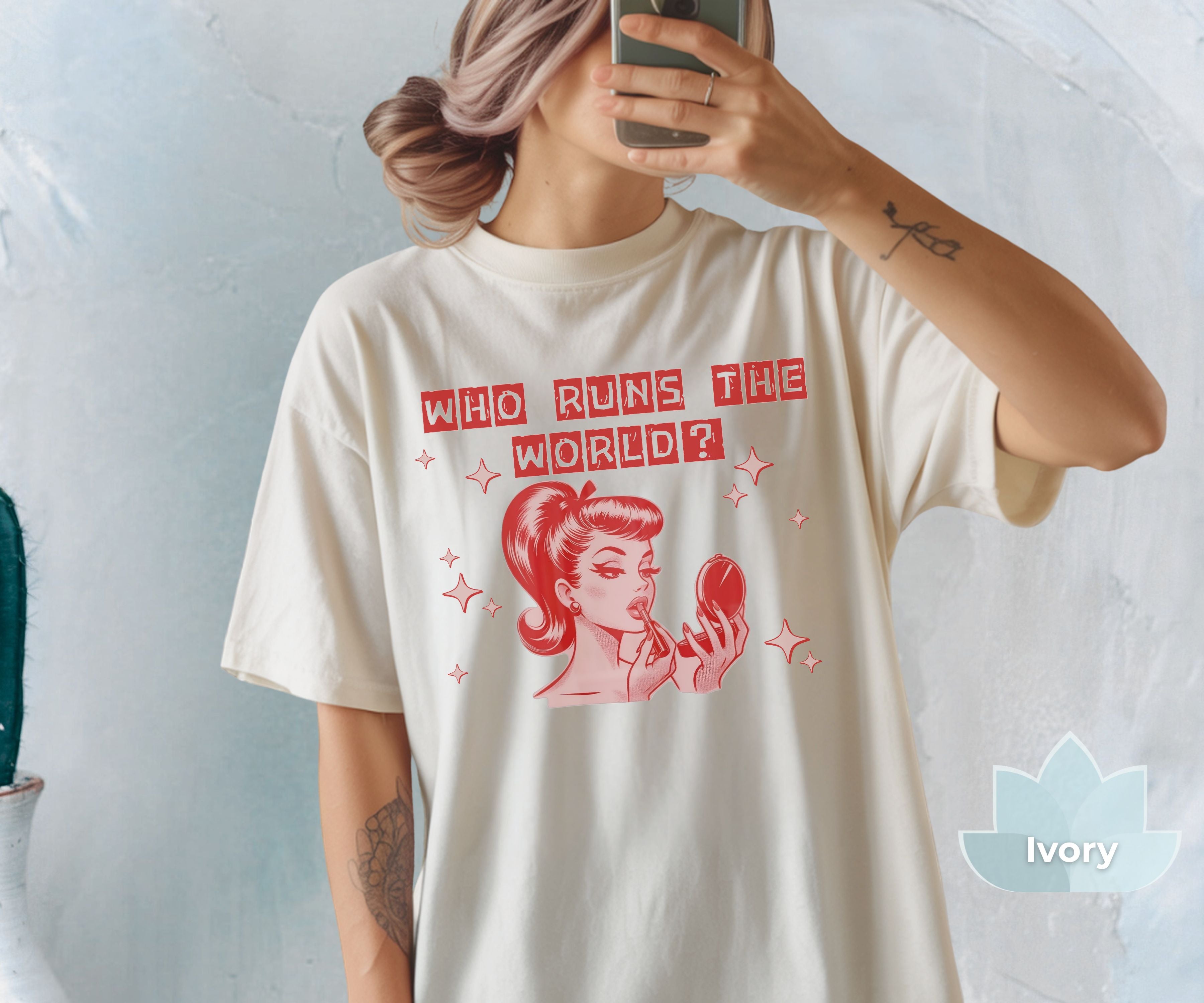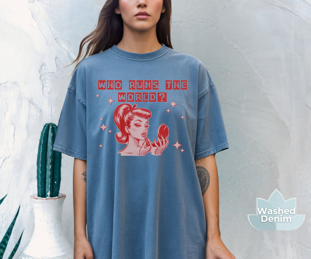 Channel your inner powerhouse with this vintage-inspired “Who Runs the World?” tee, designed for women who lead with confidence, charm, and unstoppable energy. Our T-shirts are garment-dyed for that unique worn look and don't forget to check out our Fit Guide in the product images for an oversized look.