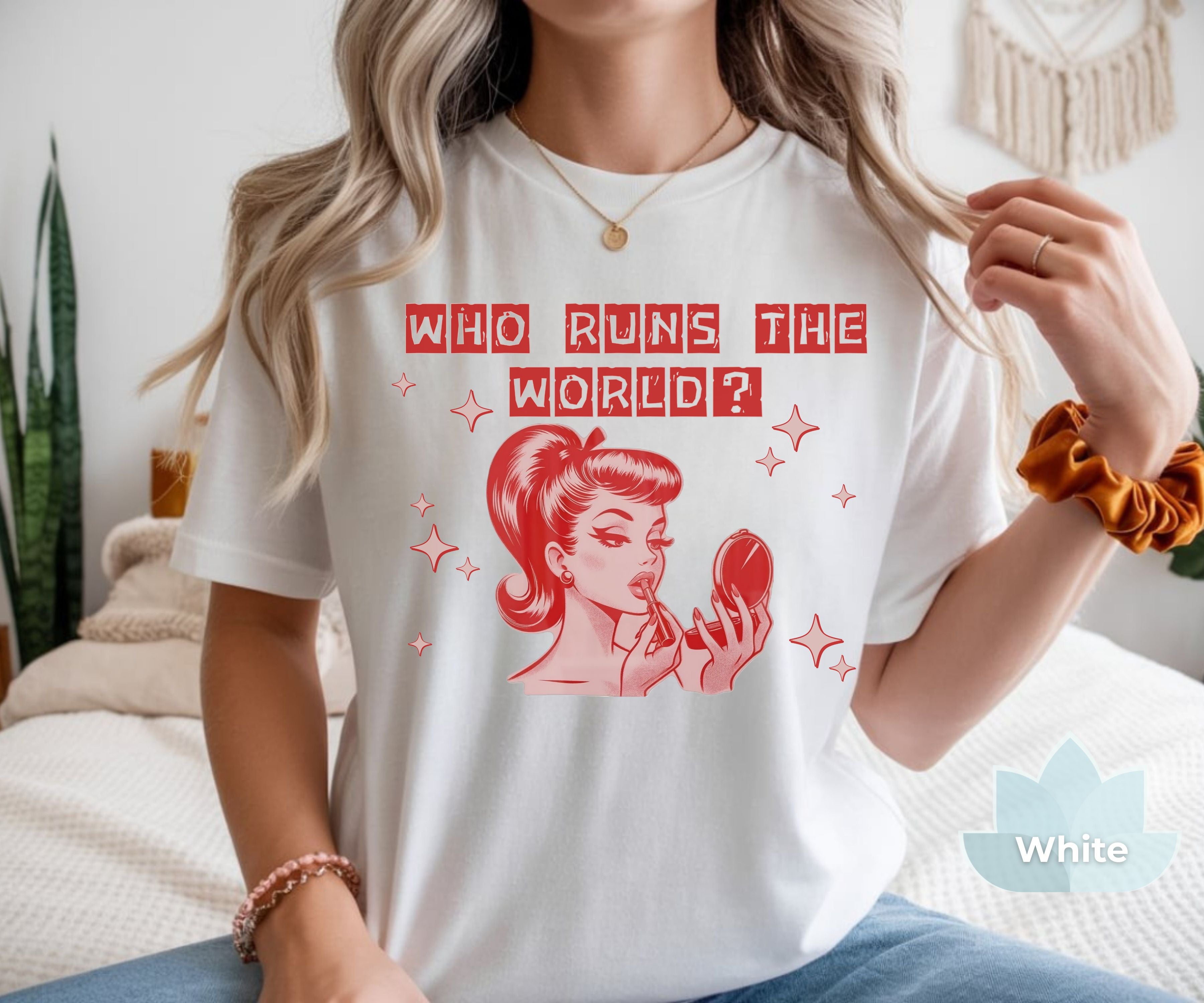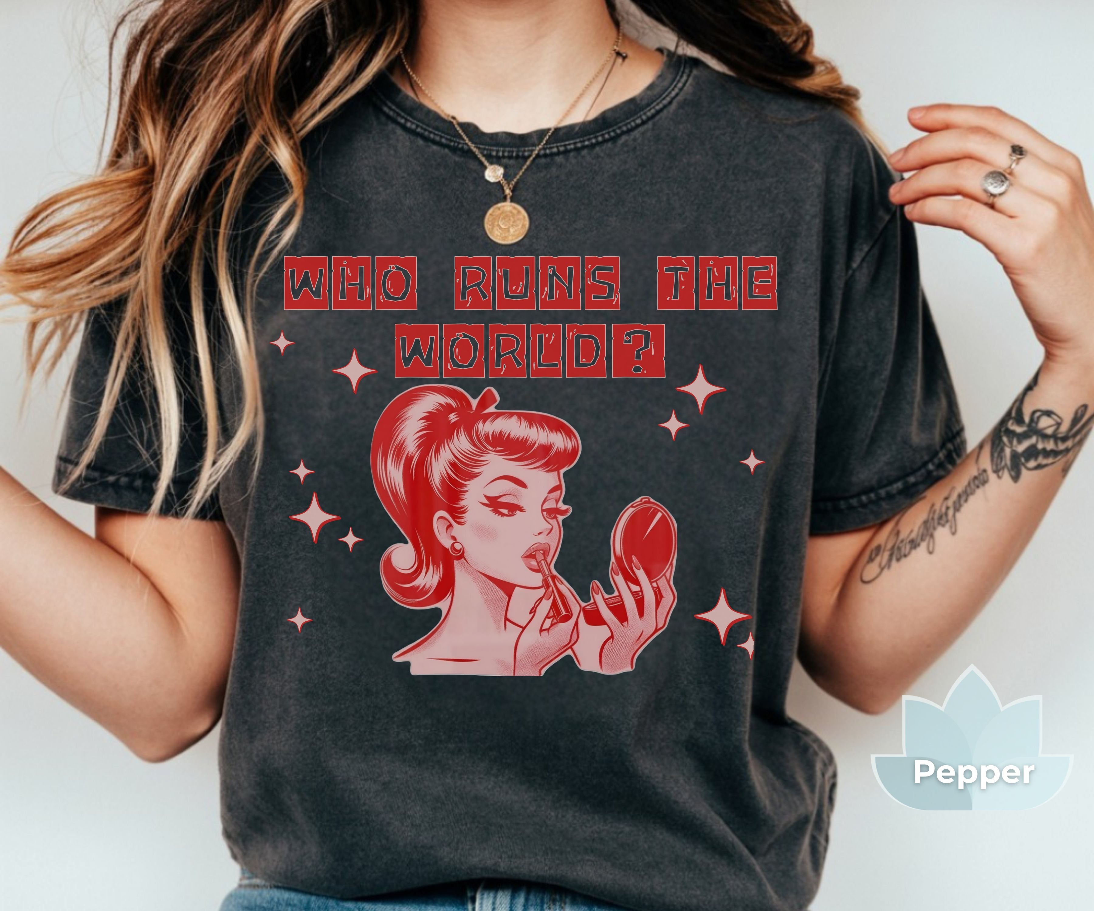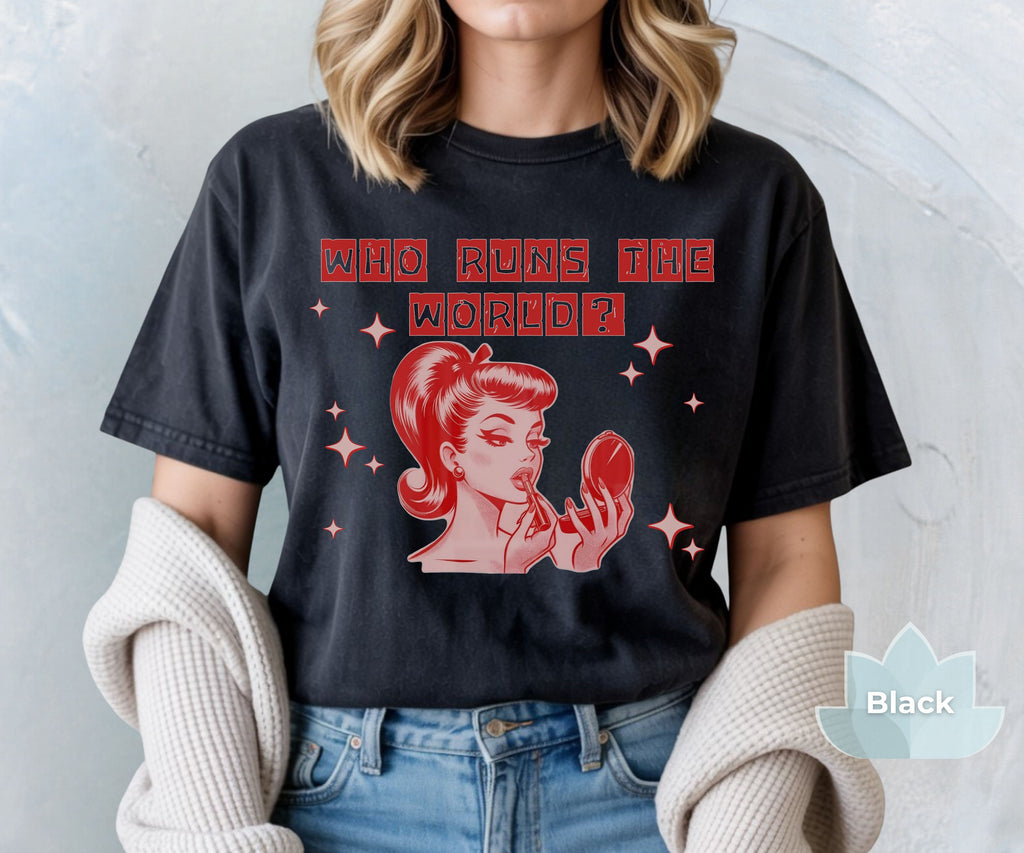 Channel your inner powerhouse with this vintage-inspired “Who Runs the World?” tee, designed for women who lead with confidence, charm, and unstoppable energy. Our T-shirts are garment-dyed for that unique worn look and don't forget to check out our Fit Guide in the product images for an oversized look.