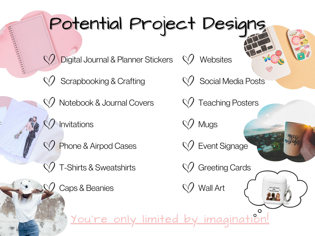 Professional: social media posts, websites, blogging, brochures, business cards, logos, packaging, party planning (invitations & signs), teaching aids (posters & activities), Print on Demand (POD) business owners.