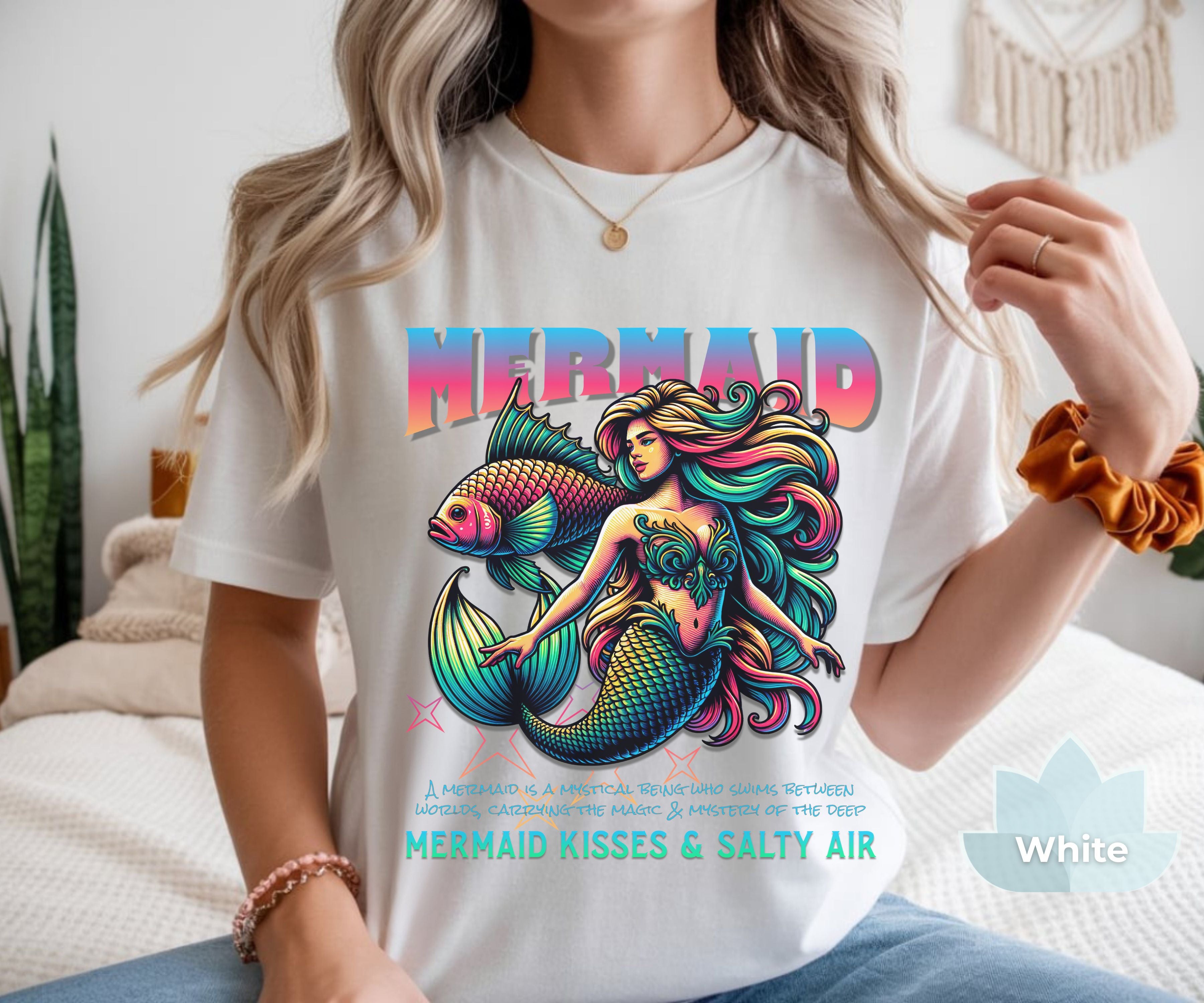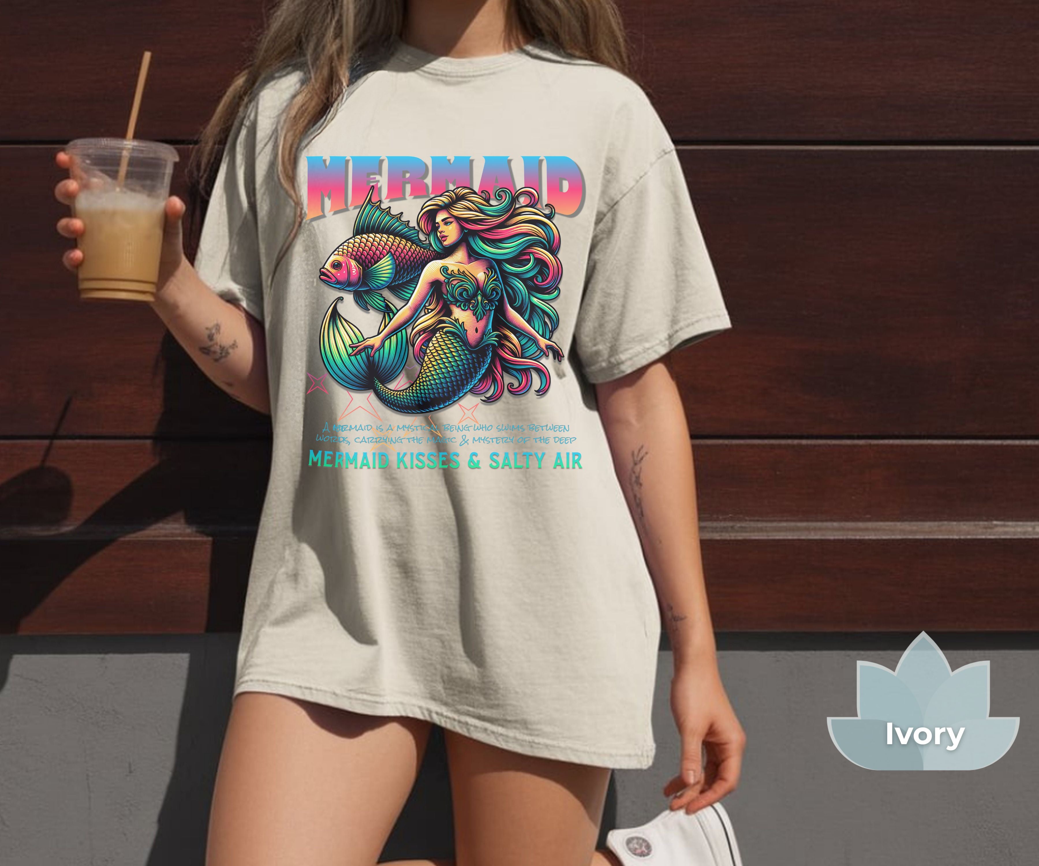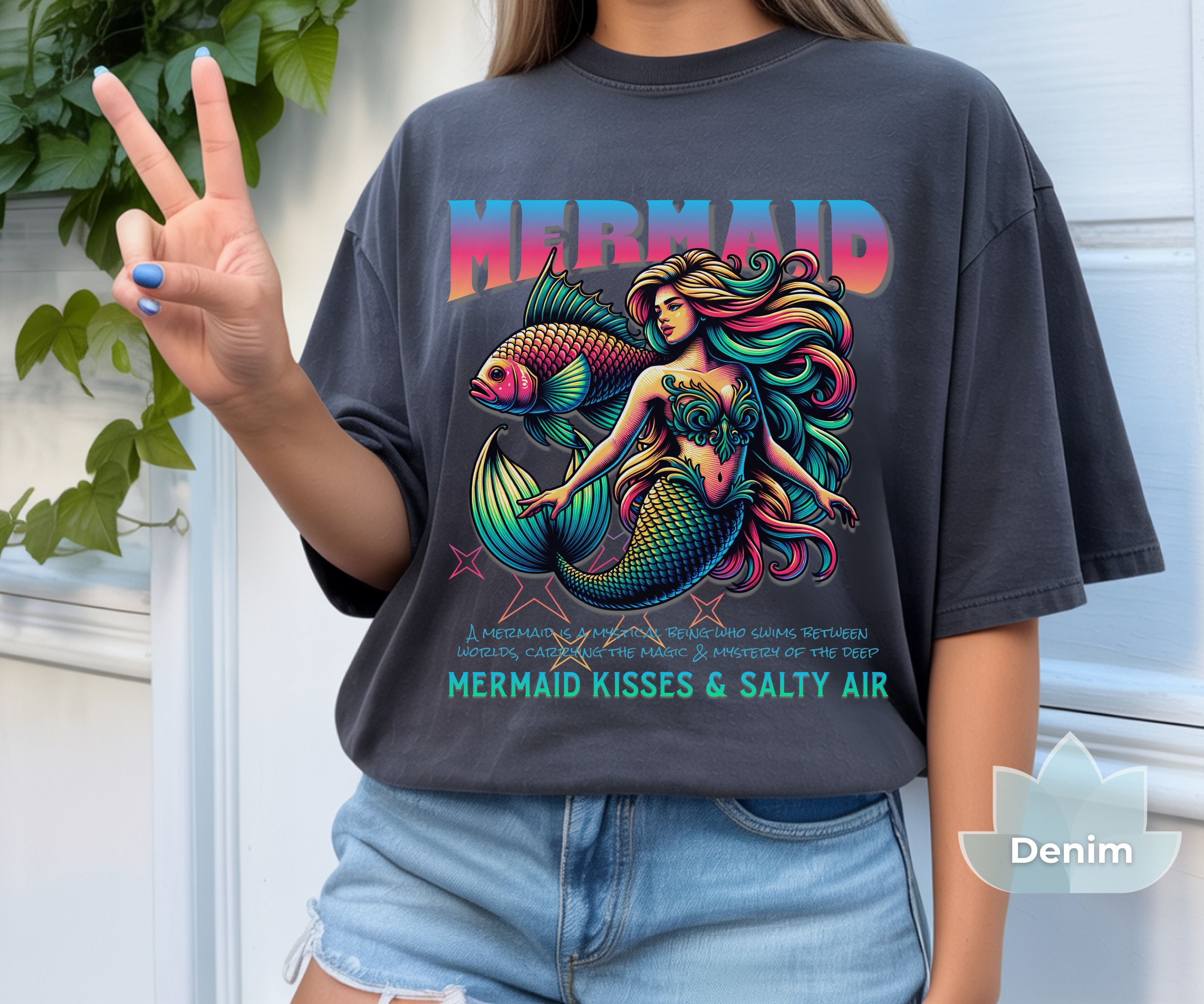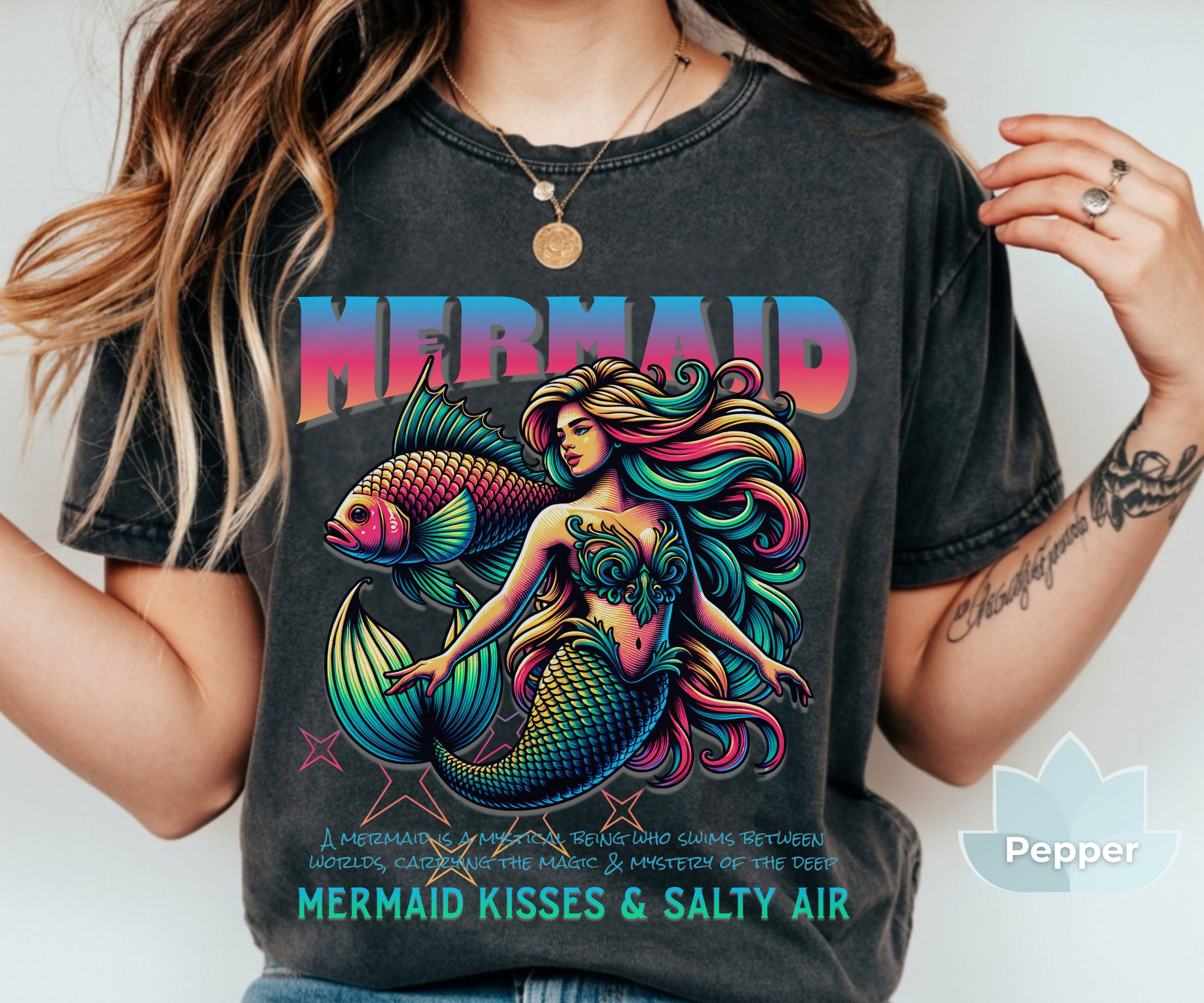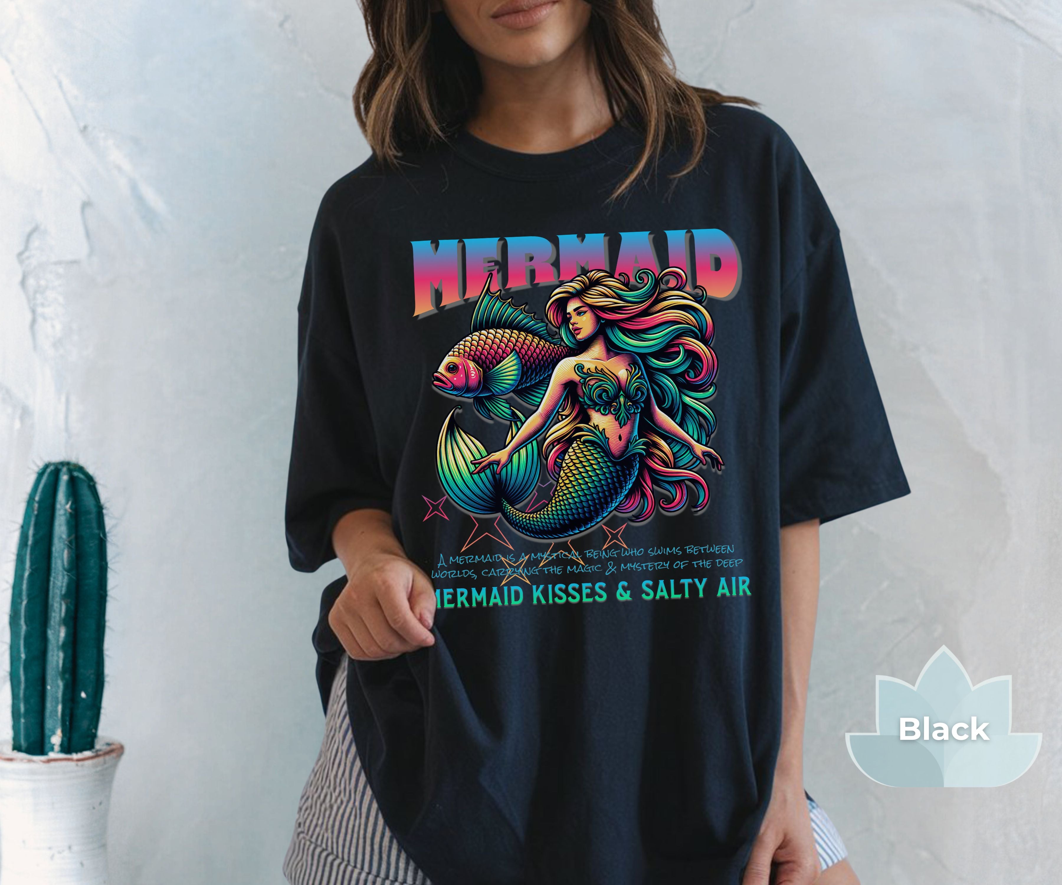 The Bring the magic of the deep sea to your wardrobe with this stunning fierce mermaid. Our T-shirts are garment-dyed for that unique worn look and don't forget to check out our Fit Guide in the product images for an oversized look.