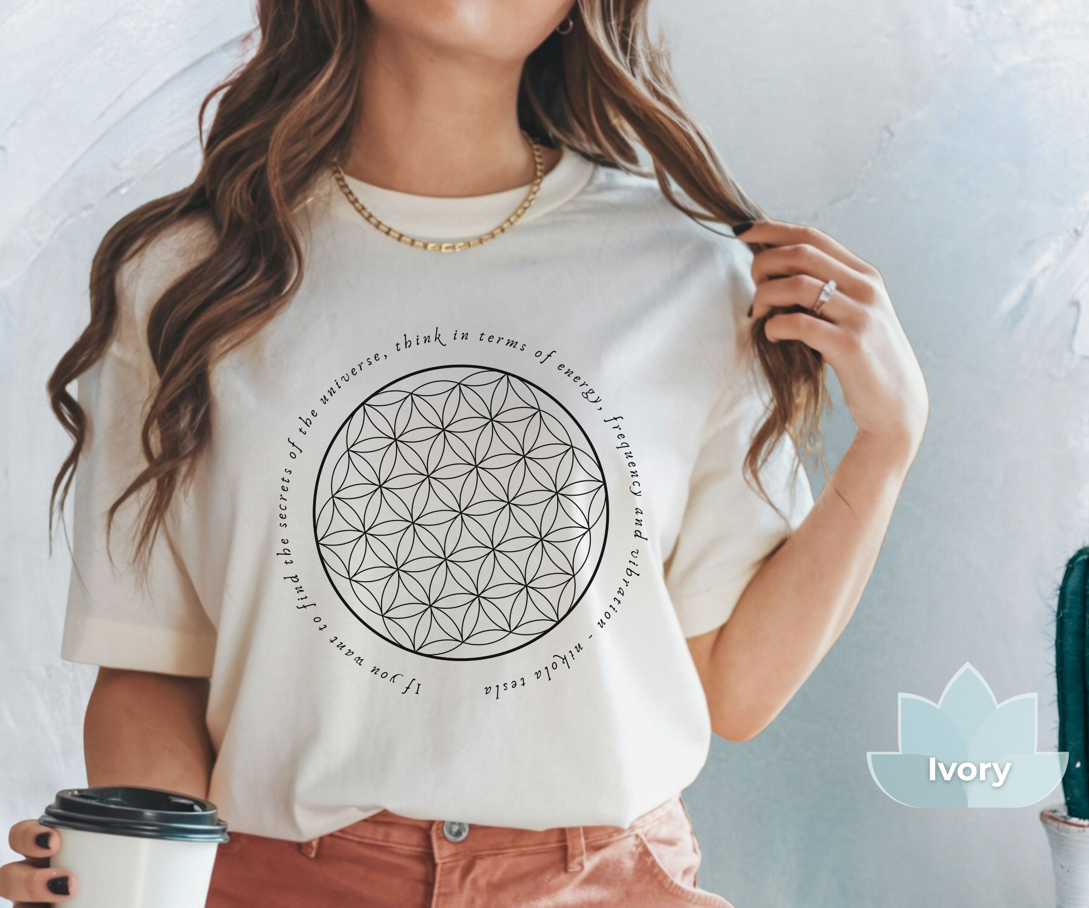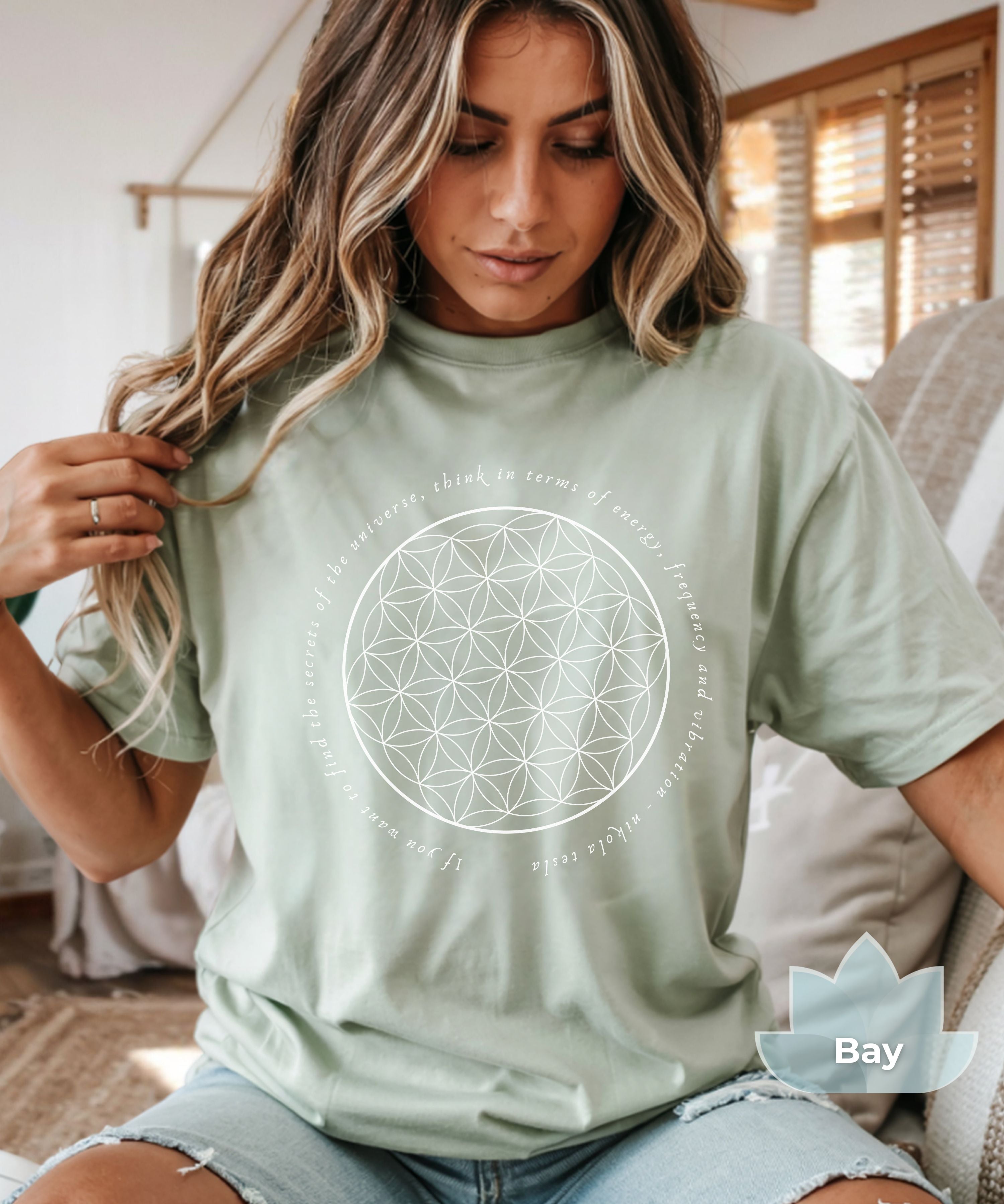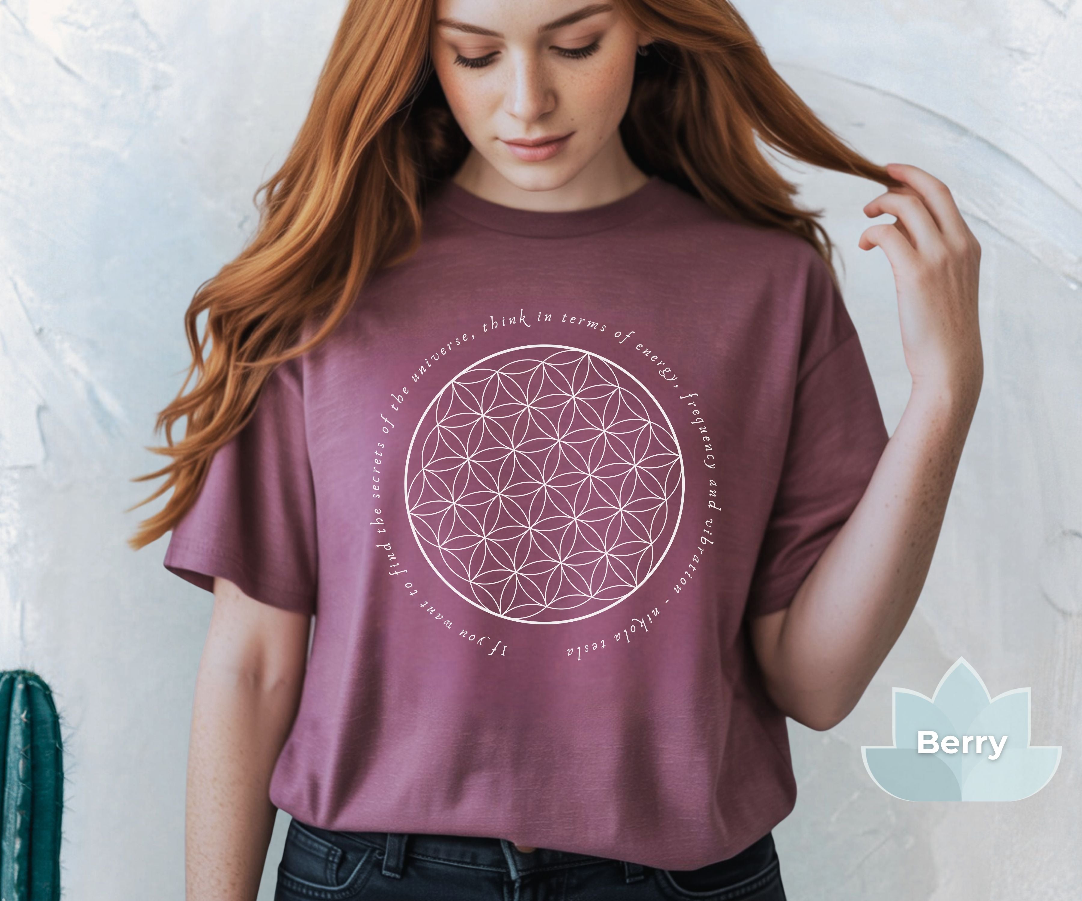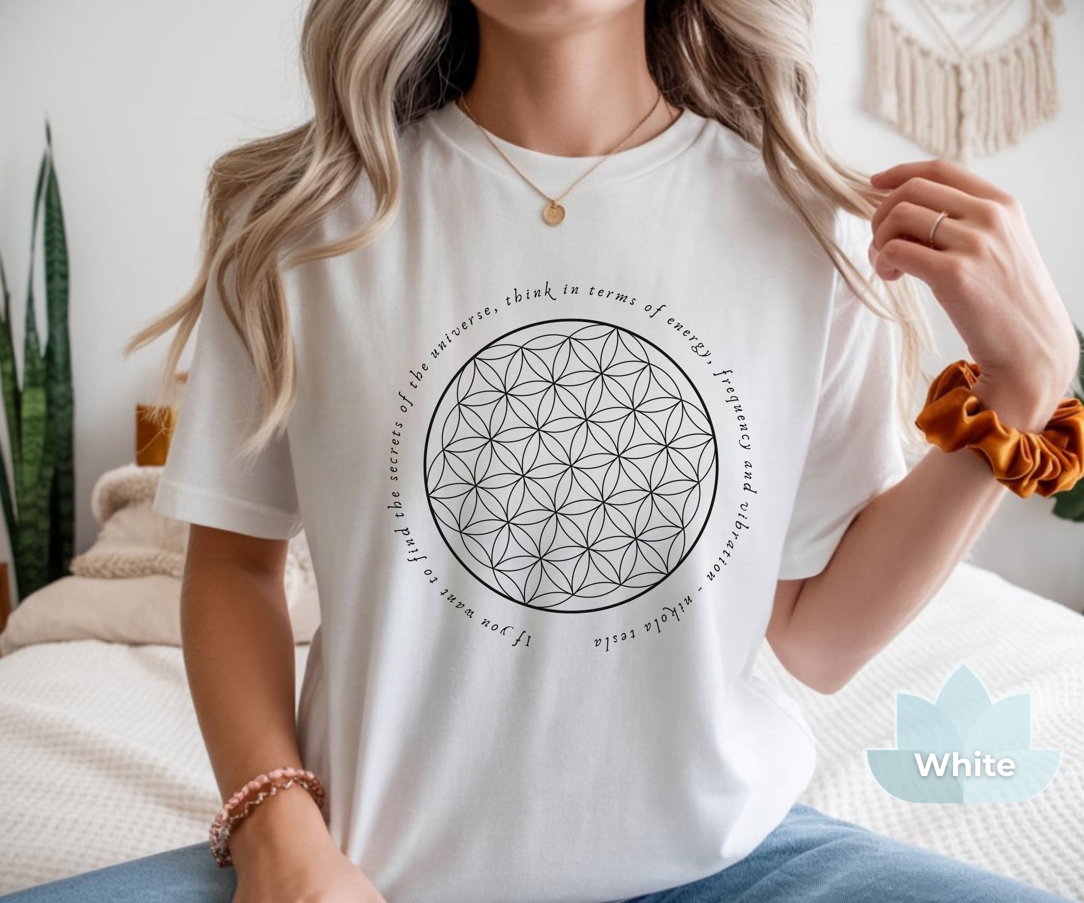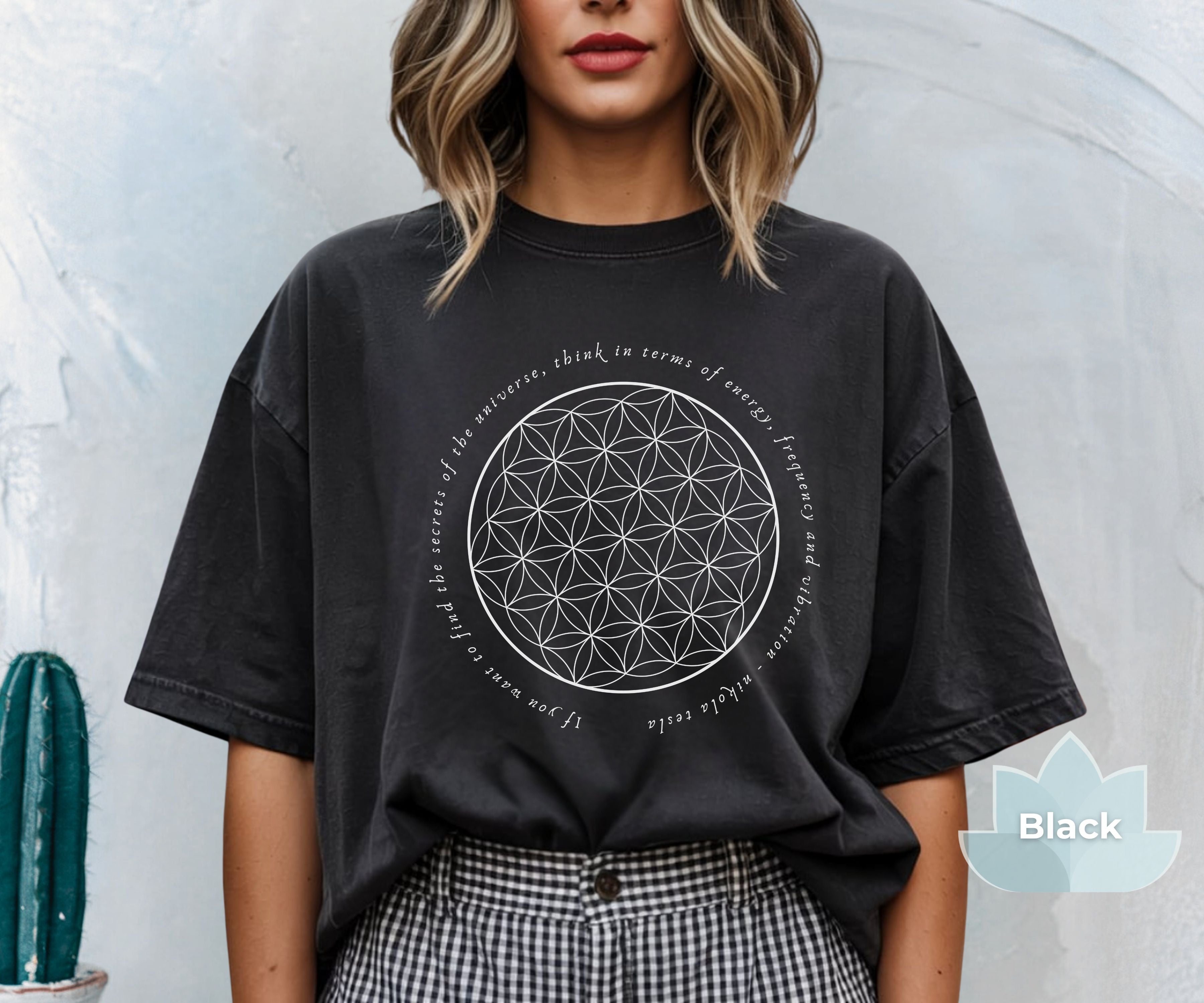 This design features the profound Flower of Life symbol which is a foundational blueprint of the universe - encircled by Tesla's powerful quote: "If you want to find the secrets of the universe, think in terms of energy, frequency and vibration."
