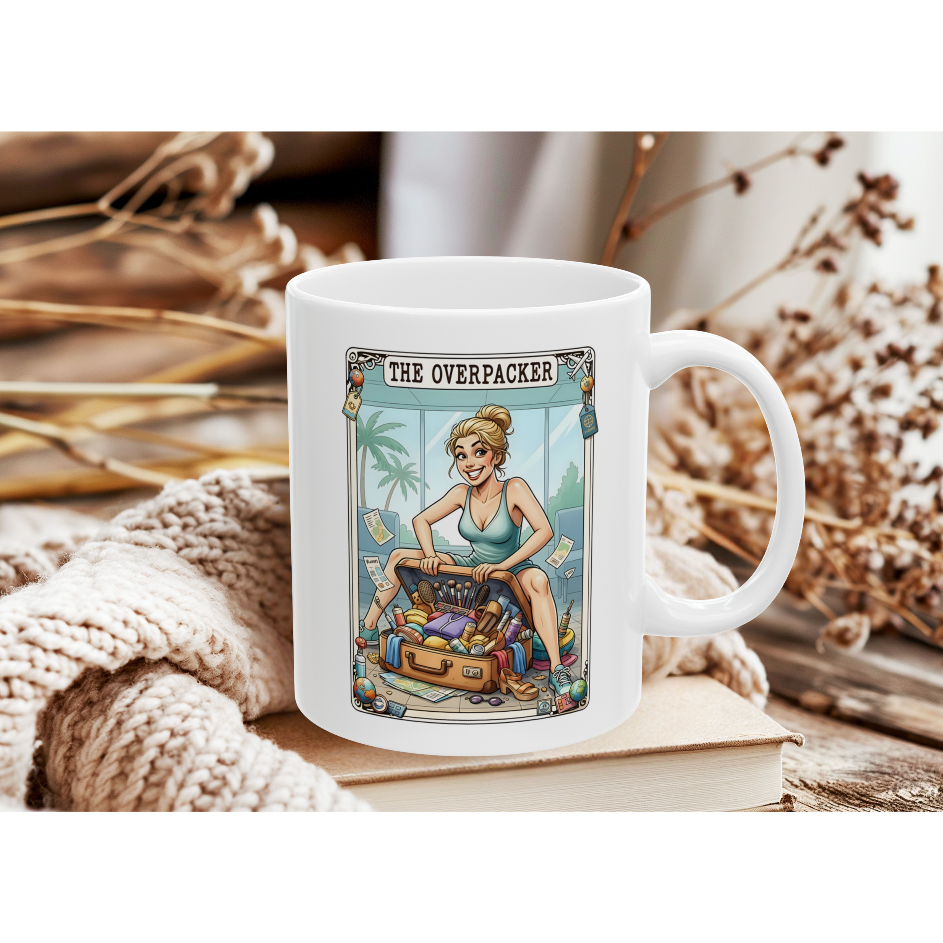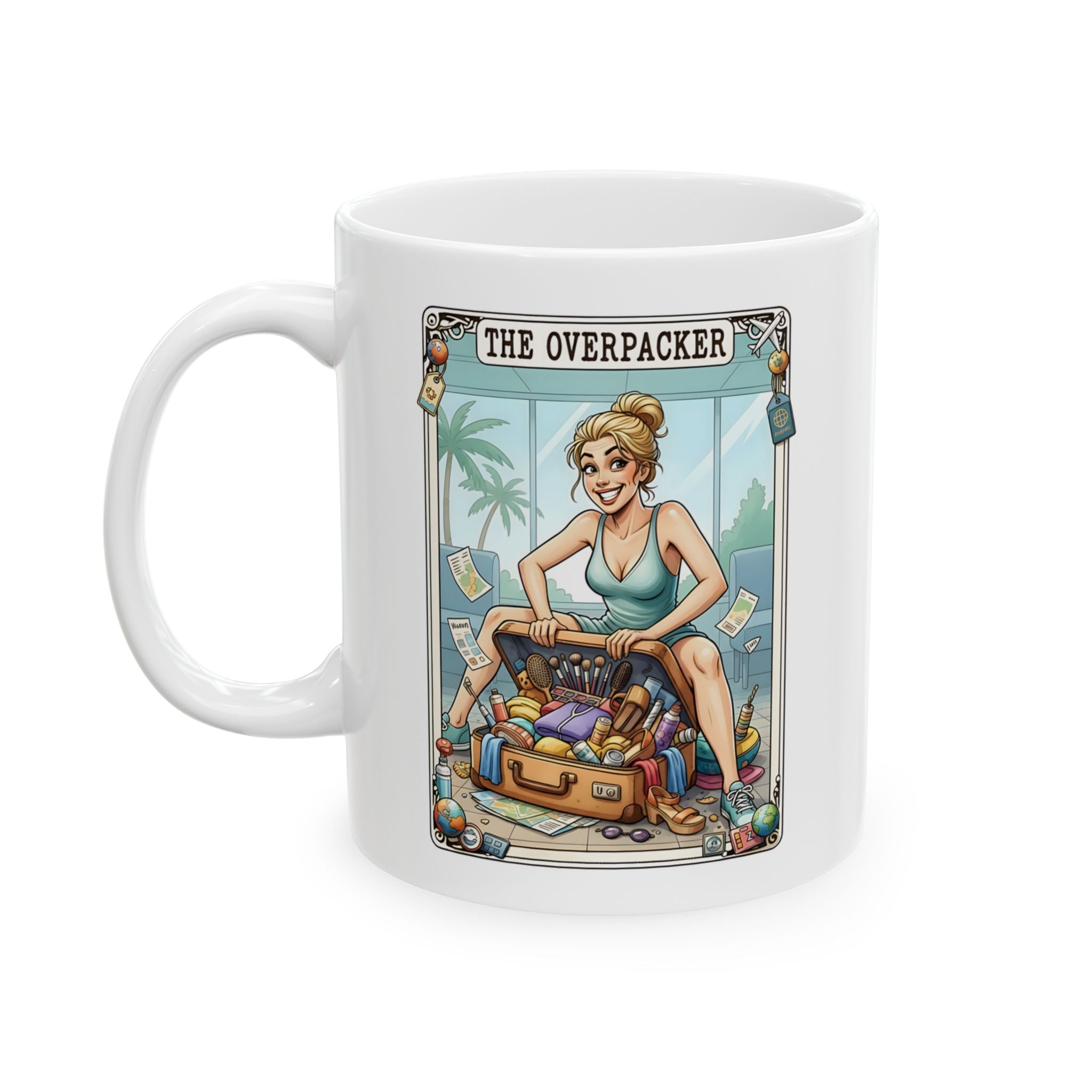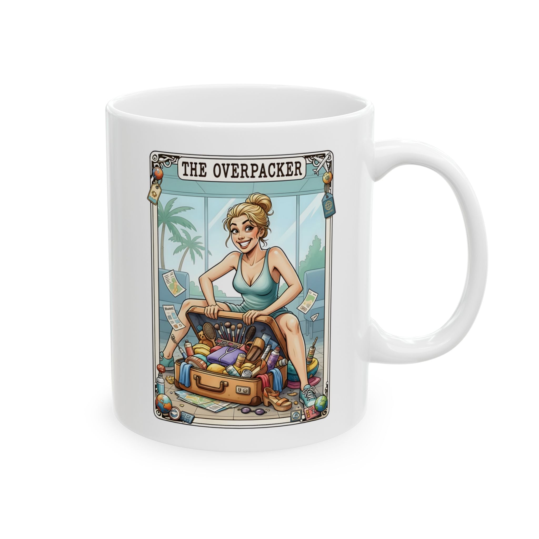 Start your day with a dose of humour with this taro card Overpacker mug. This mug is the perfect for morning coffee, pre-flight caffeine or dreaming about your next getaway. Crafted from high-quality ceramic, this durable mug is microwave and dishwasher safe, making it both practical and stylish.