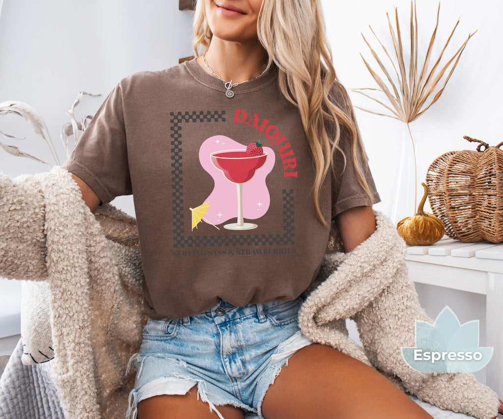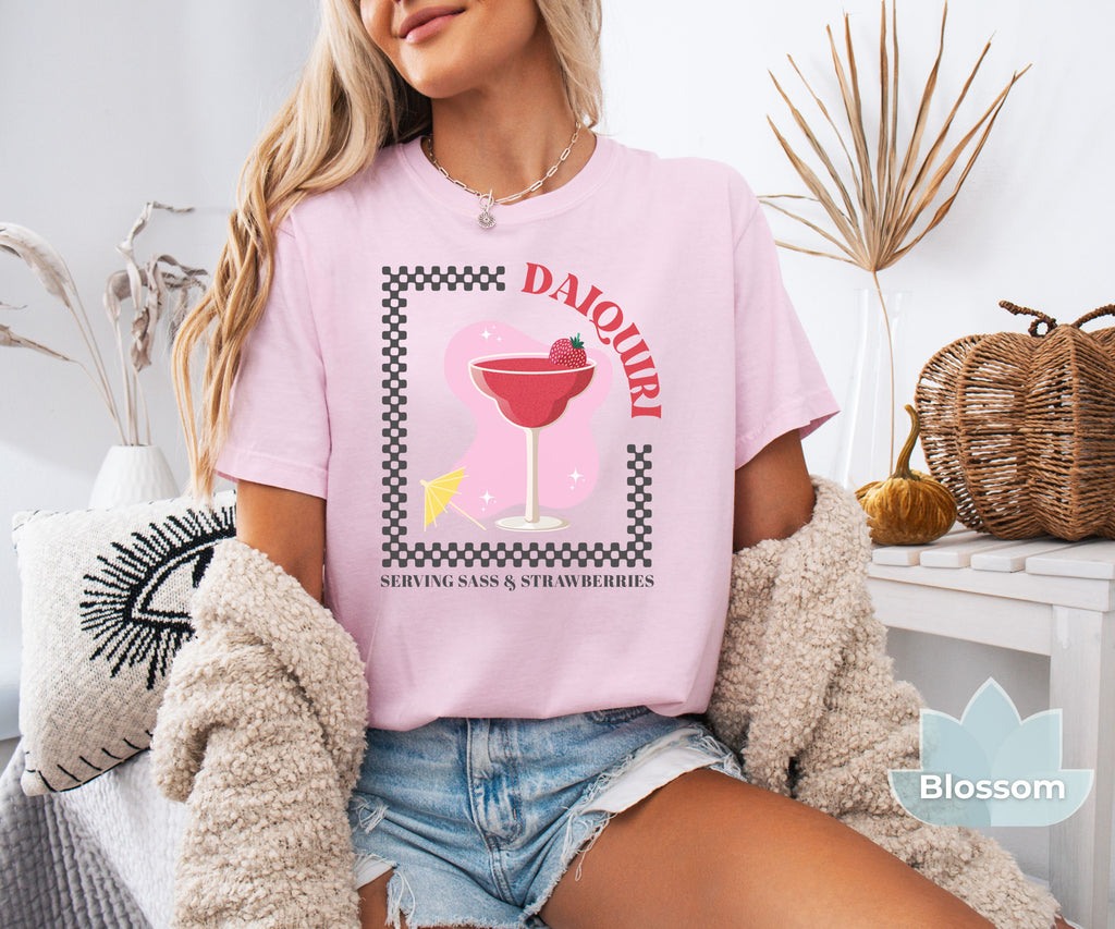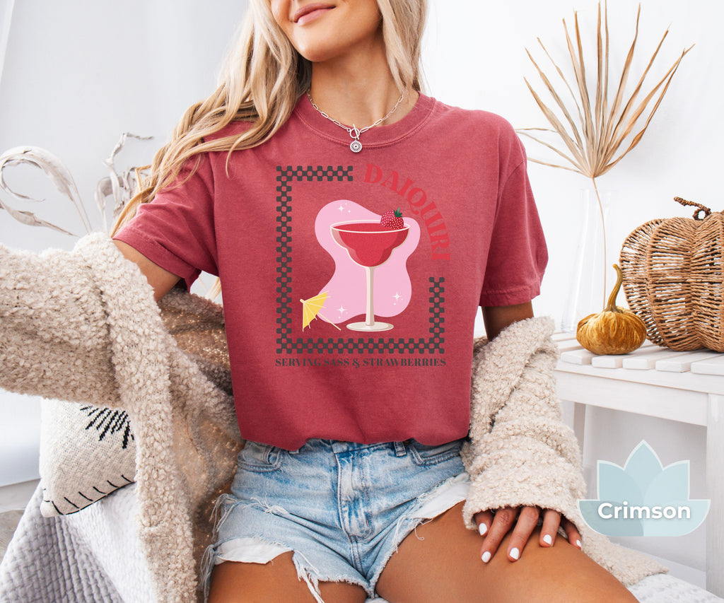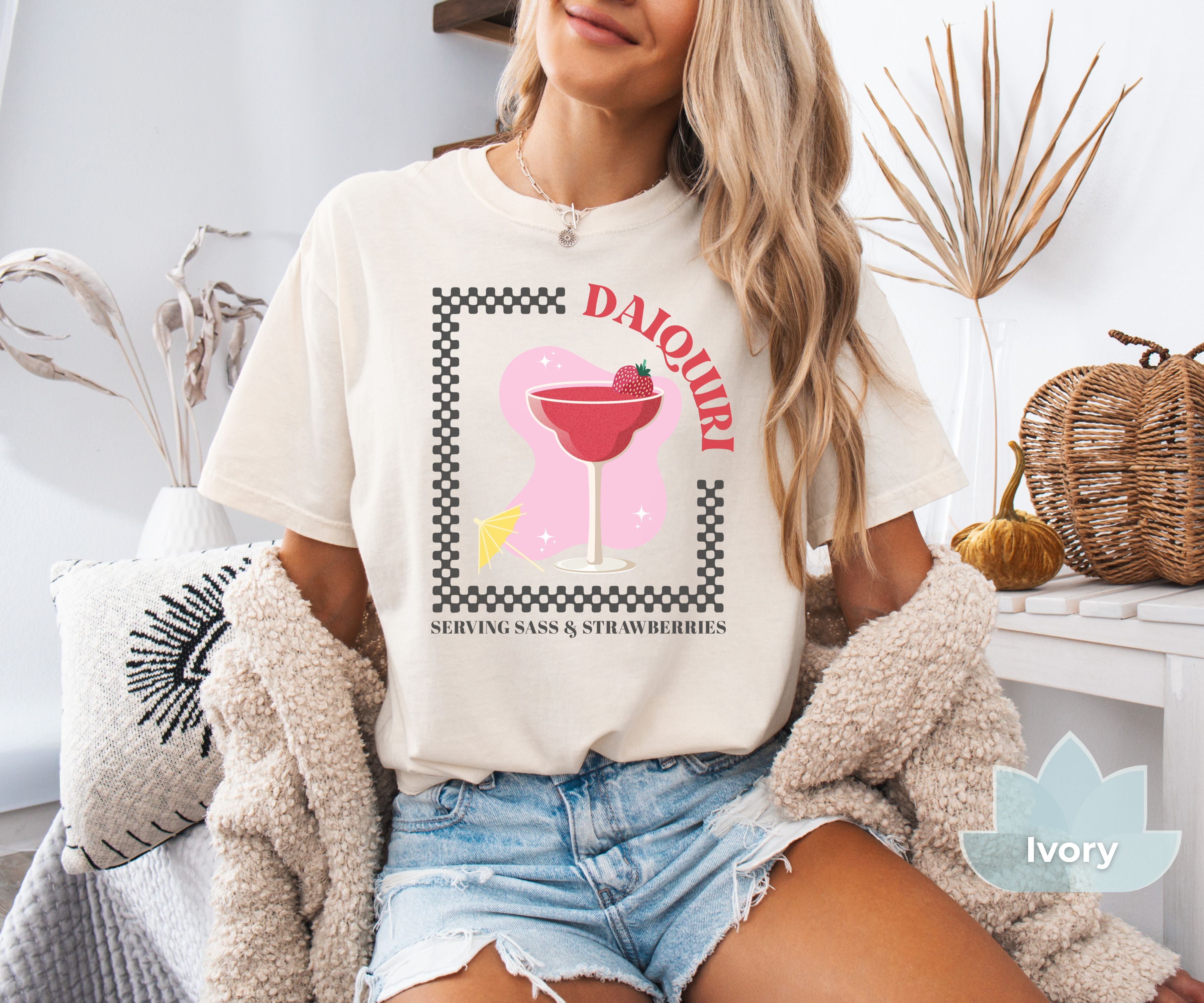 Our fun and flirty “Daiquiri - Serving Sass & Strawberries” tee is the perfect shirt for your new on the go summer top. Our T-shirts are garment-dyed for that unique worn look and don't forget to check out our Fit Guide in the product images for an oversized look.